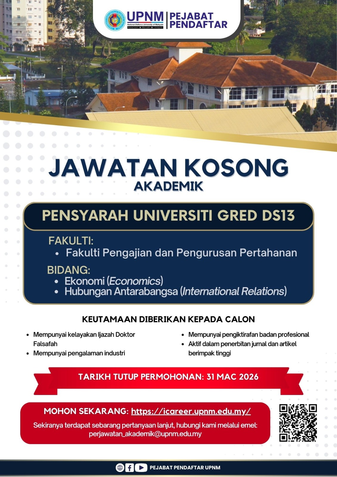 Sukacita dimaklumkan bahawa pihak UPNM berbesar hati mempelawa individu yang berminat dan berkelayakan untuk mengisi kekosongan jawatan akademik .