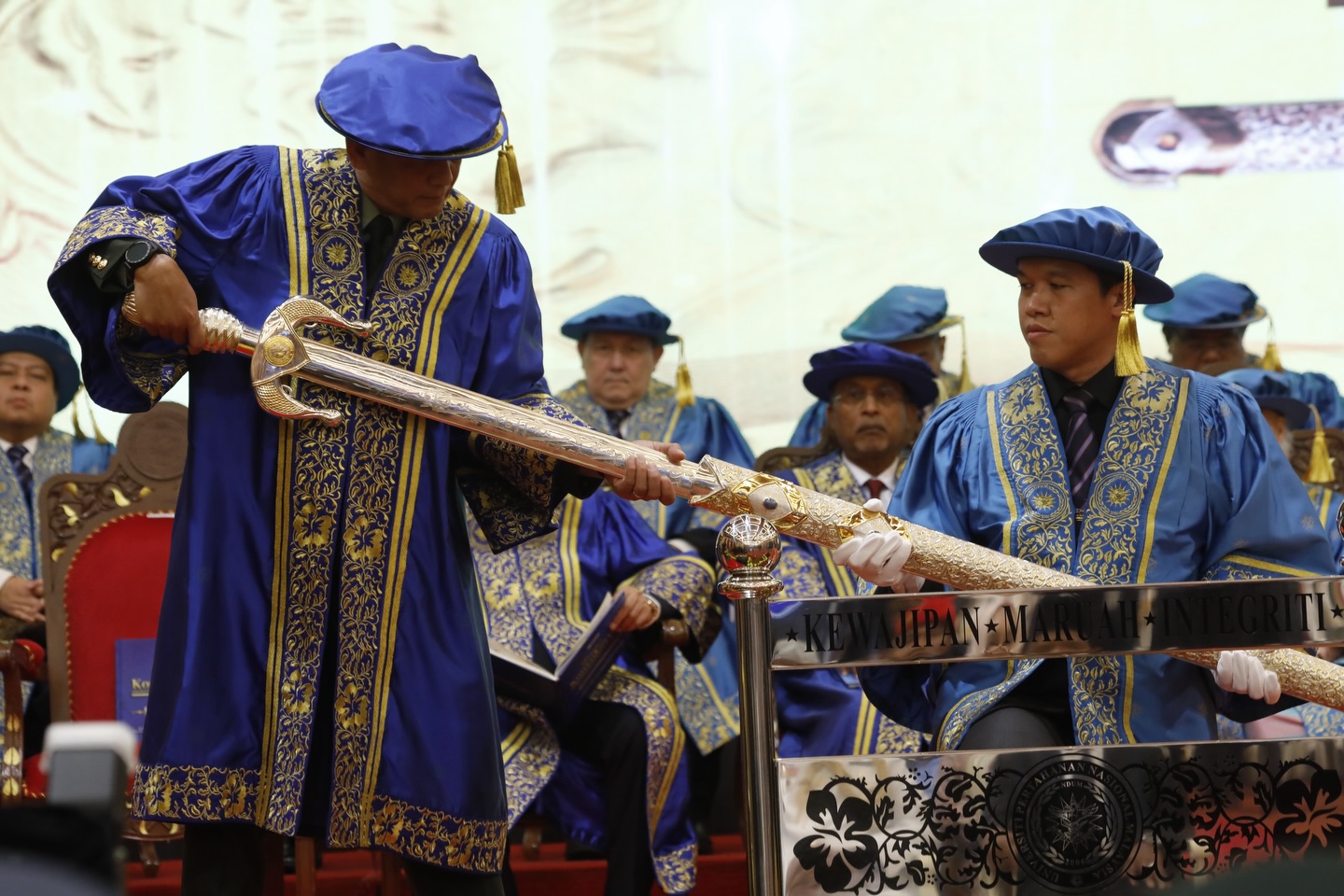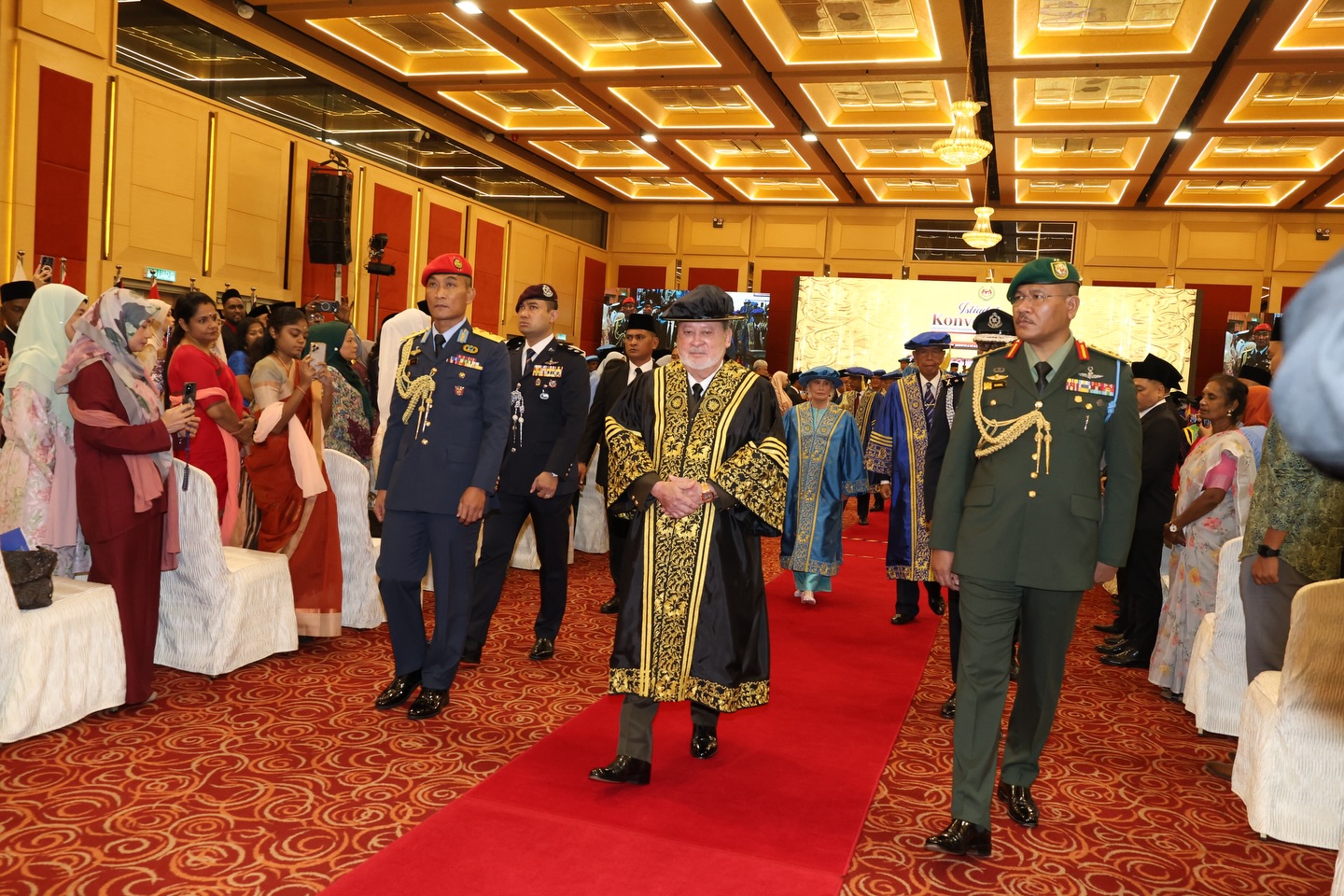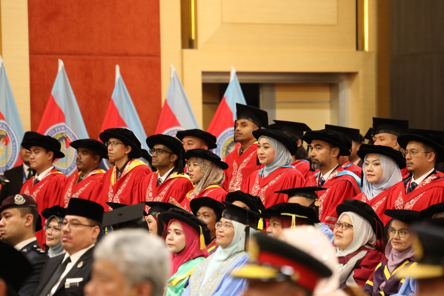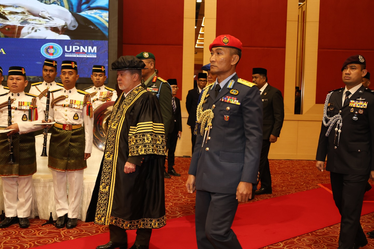 Turut hadir YBhg. Laksamana Tan Sri Dato’ Setia (Dr.) Mohd Anwar bin Haji Mohd Nor (Bersara), Pro-Canselor, YB Dato’ Seri Diraja Dr. Zambry Abd Kadir, Menteri Pendidikan Tinggi, YB Dato’ Seri Mohamed Khaled bin Nordin, Menteri Pertahanan dan barisan Lembaga Pengarah Universiti.