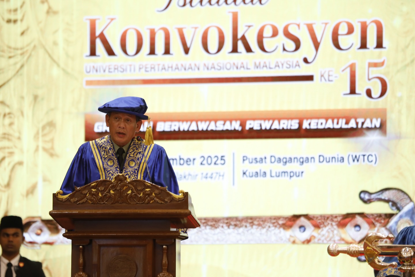 2 DISEMBER 2025 | KUALA LUMPUR: Istiadat Konvokesyen Ke-15 UPNM bermula hari ini dengan penuh istiadat apabila Kebawah Duli Yang Maha Mulia Seri Paduka Baginda Yang di-Pertuan Agong Sultan Ibrahim, selaku Tuanku Canselor UPNM, berkenan menyempurnakan Sidang Pertama di Pusat Dagangan Dunia (WTC) Kuala Lumpur.