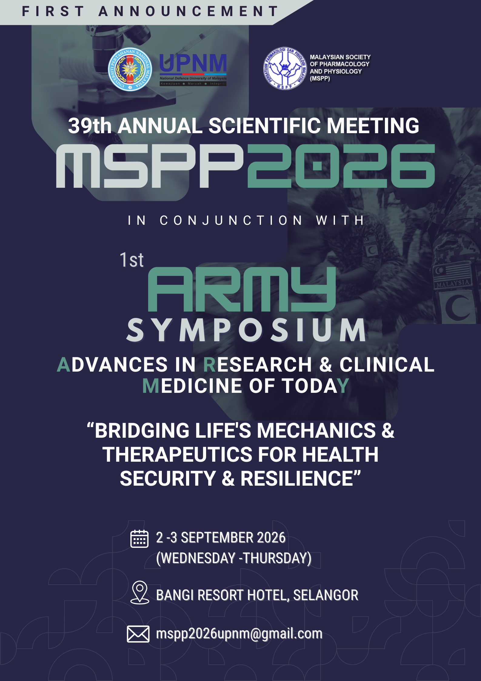 The Malaysian Society of Pharmacology & Physiology (MSPP), in collaboration with Universiti Pertahanan Nasional Malaysia (UPNM), would like to invite fellow academics, researchers and postgraduate students to participate in our upcoming 39th Annual Scientific Meeting 2026 and 1st Advances in Research and Clinical Medicine of Today (ARMY) symposium, which will be held on