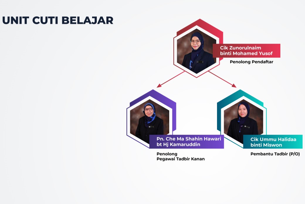 - Menguruskan rekod berkaitan Cuti Belajar/Cuti Pasca Doktoral dan Sub Kepakaran/Cuti Sabatikal termasuk mengesahkan rekod buku perkhidmatan melalui Sistem Maklumat Personal (SMP).