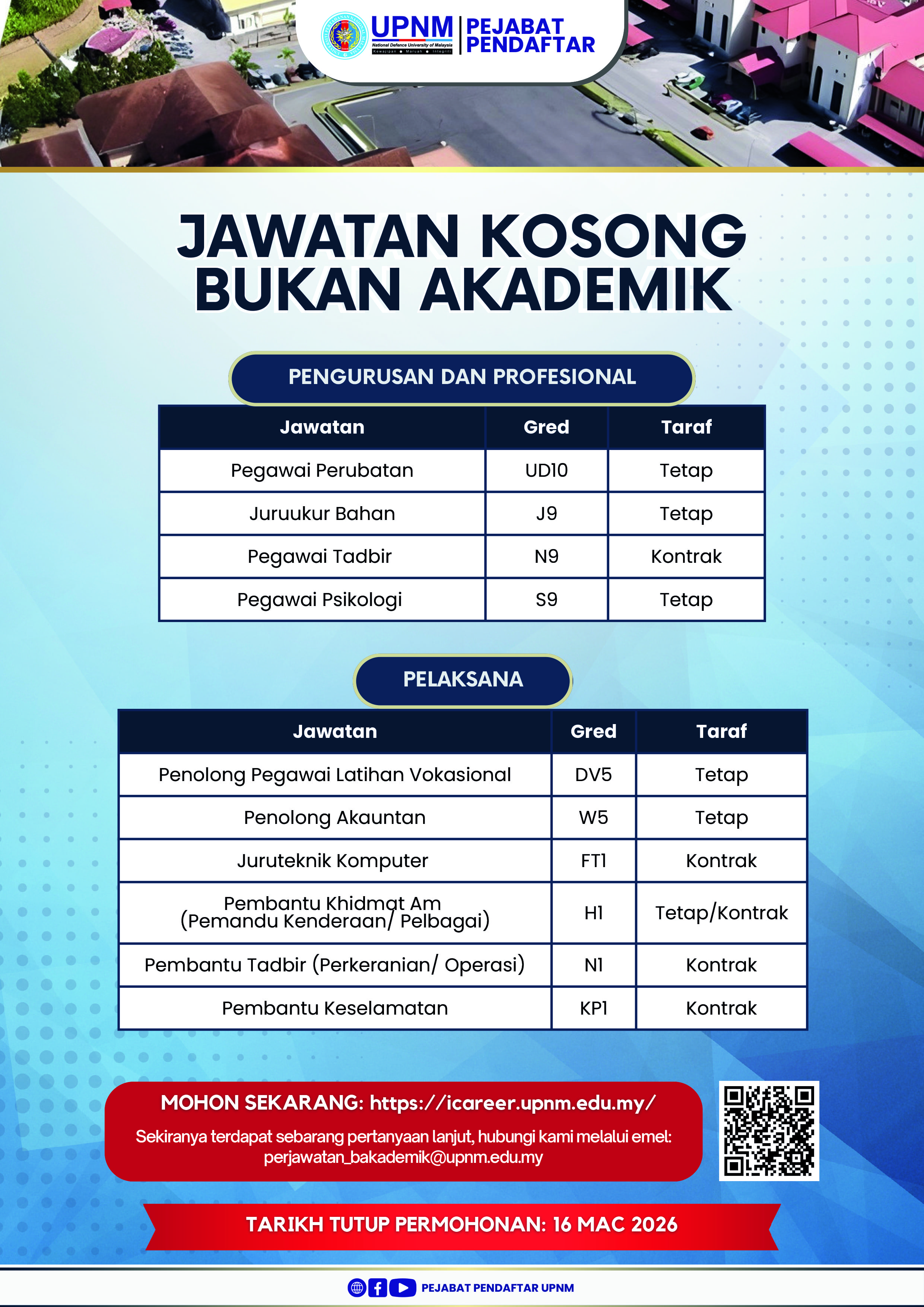 Permohonan jawatan boleh dibuat melalui laman web i-Career di capaian https://icareer.upnm.edu.my.