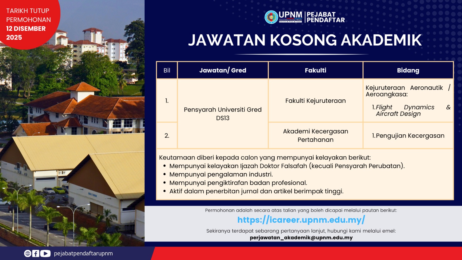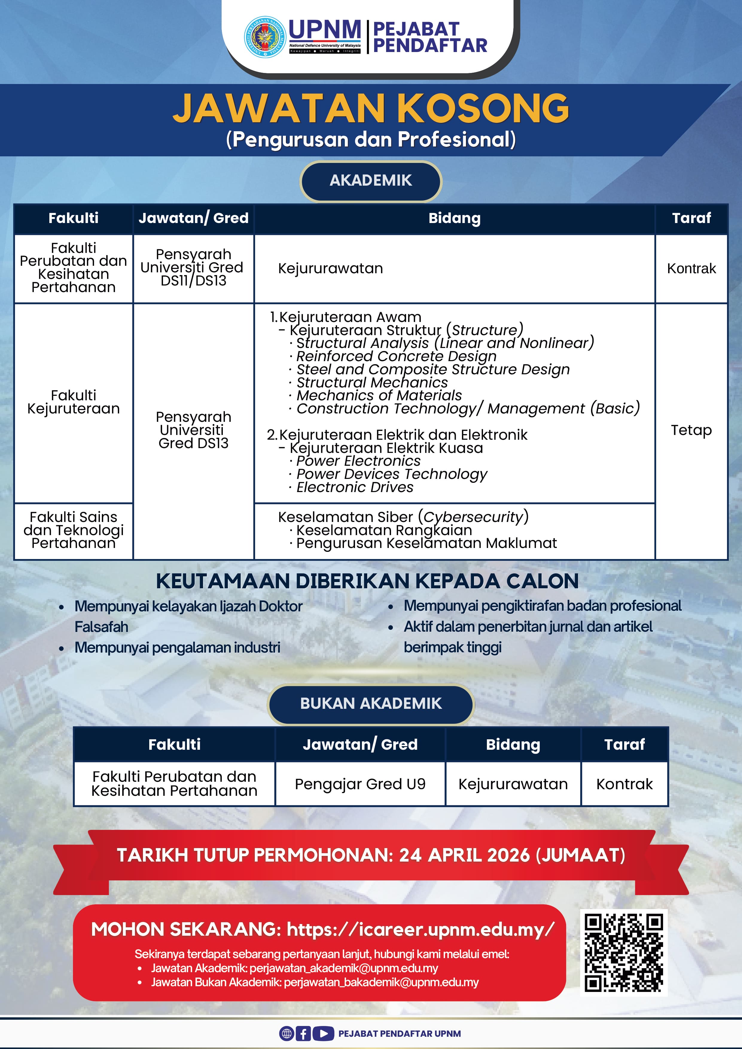 Permohonan jawatan boleh dibuat melalui laman web i-Career di capaian https://icareer.upnm.edu.my.