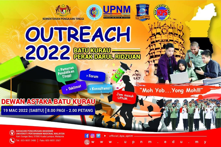 Pada 19 Mac 2022 telah berlangsung Program Outreach 2022 di mana UPNM telah dilantik sebagai penganjur oleh pihak Jabatan Pendidikan Tinggi, Kementerian Pengajian Tinggi. Program Outreach ini bertujuan untuk mempromosi dan menyebarluas peluang pendidikan tinggi ke Institusi Pengajian Tinggi Awam (IPTA) dan Institusi Latihan Kemahiran Awam (ILKA) yang berkaitan serta kemudahan pembiayaan pendidikan yang disediakan oleh pihak kerajaan.