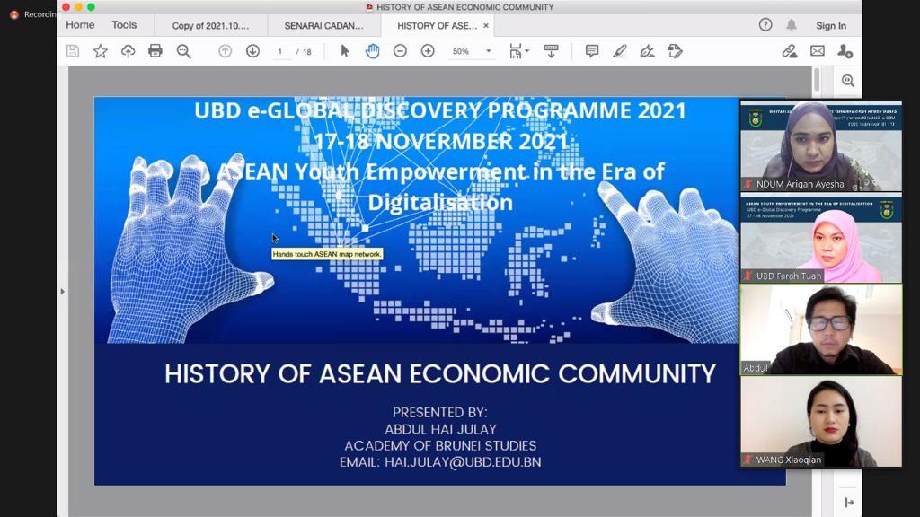 Bersempena dengan “ASEAN Chairmanship in 2021” Brunei Darussalam, UBD telah menganjurkan satu program yang bertajuk “ASEAN e-Global Discovery Programme” pada 17-18 November 2021 yang lalu. Sukacita dimaklumkan bahawa pelajar Universiti Pertahanan Nasional Malaysia, yang diwakili oleh Cik Ariqah Ayesha binti Ahmad Feisal dari Pusat Bahasa telah terpilih untuk menyertai sesi perkongsian ini. Objektif ASEAN e-Global Discovery Programme ini adalah untuk memperkasakan golongan belia dalam meluaskan pengetahuan dan pemahaman mereka berkenaan komuniti ASEAN. Para peserta telah berpeluang berbincang dengan penceramah jemputan dan berkongsi nilai dan budaya ASEAN dari perspektif belia. Para peserta seterusnya mempunyai gambaran lebih jelas berkenaan isu-isu penting yang dihadapi ASEAN dan mempunyai motivasi yang tinggi untuk lebih aktif menjadi sebahagian daripada komuniti ASEAN.