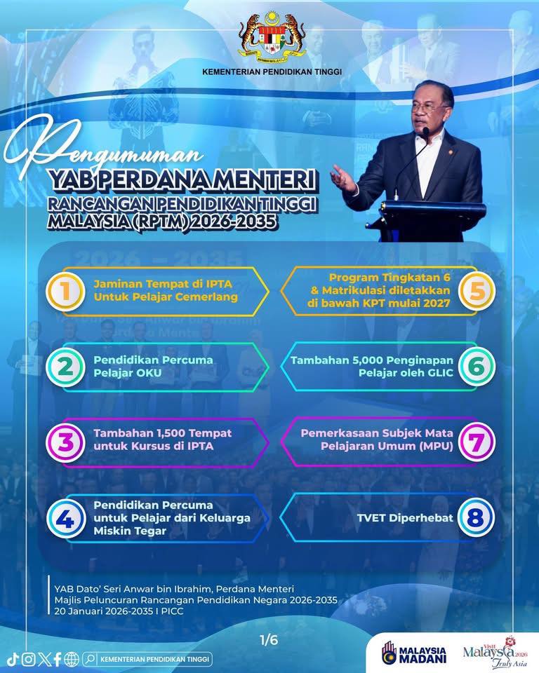 20 JANUARI 2026 | PUTRAJAYA: UPNM menyatakan sokongan penuh terhadap peluncuran Rancangan Pendidikan Tinggi Malaysia (RPTM) 2026-2035 yang disempurnakan oleh Perdana Menteri, YAB Dato’ Seri Anwar Ibrahim di Dewan Perdana, Pusat Konvensyen Antarabangsa Putrajaya (PICC), hari ini.
